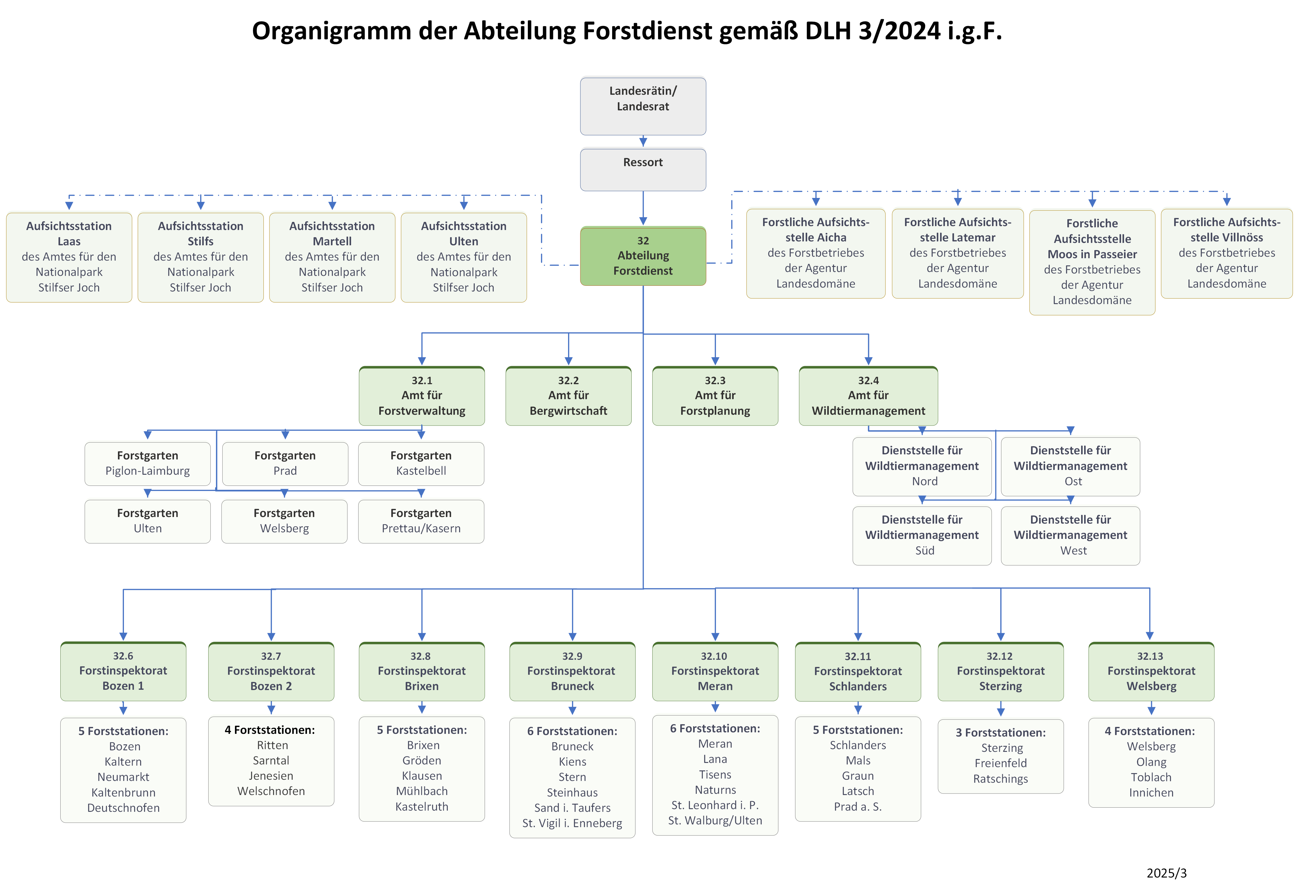 - sowie 12 Ämtern mit insgesamt 38 Forststationen und 4 Dienststellen für Wildtiermanagement und ist kapillar über ganz Südtirol verteilt.